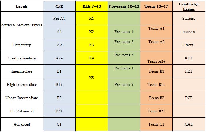There are different levels of ability and experience within our courses. A young learner is placed on a level after completing a entry tests and a spoken interview. A child’s age is also taken into consideration.